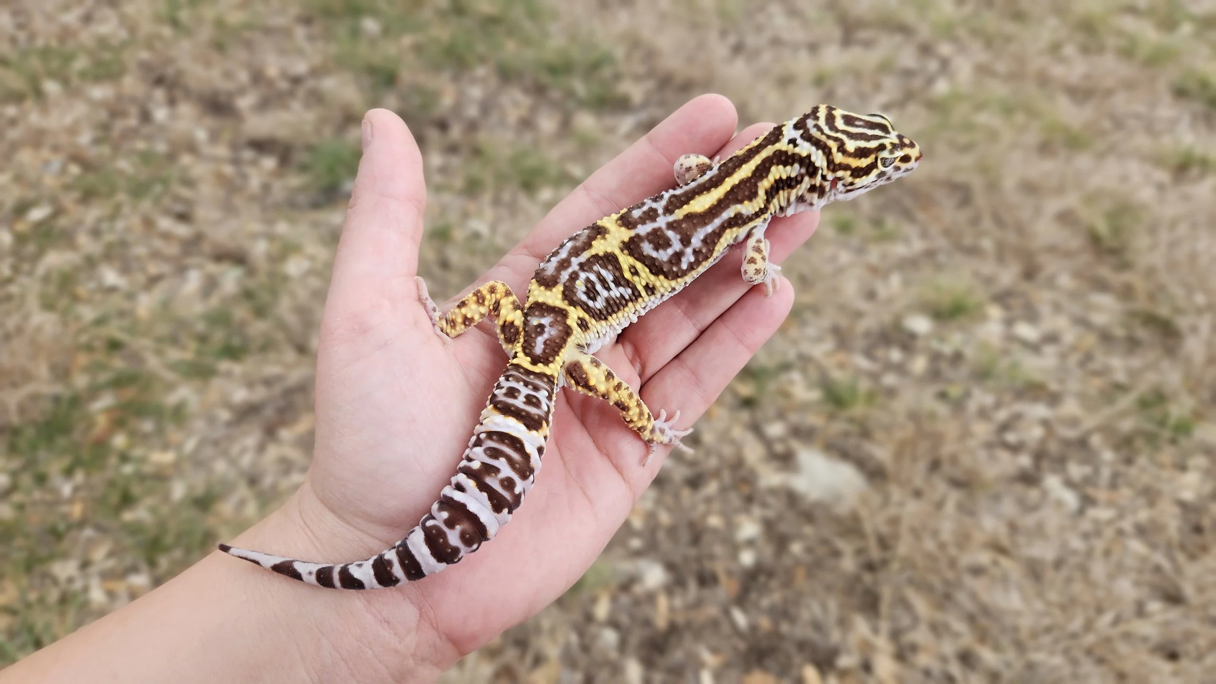 King comes from Brett’s Bell Clown Project. He was a former breeder over there but now resides here. He is our largest (by weight) leopard gecko, averaging 100-112g, but is not genetically a giant. He was paired to Rowan (see Reference Geckos) in 2024, with Ebi being our holdback baby from that pairing. He is taking a break this year.